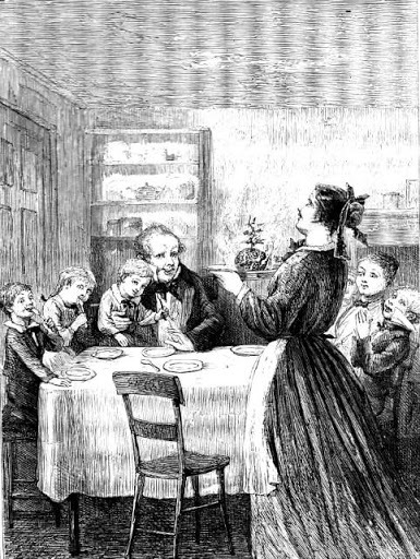 and when the long expected gush of stuffing issued forth, one murmer of delight rose round all the board, and even Tiny Tim. . . beat on the table with the handle of his knife, and feebly called Hurrah!